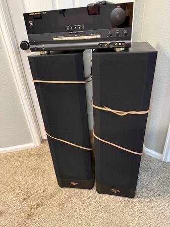Hk receiver in perfect condition and two klipsch speakers that have some minor scratches/dents If ad is up, they are available, will not respond to questions asking if they are available
