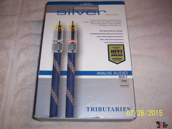 This listing is for an unused pair of cables from Tributaries. Silver Series, SCA-T analog interconnects with gold RCA connectors. Gold and Royal Blue shielding. Brand new in zip package. Purchased by me direct and never used