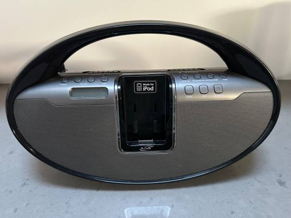 iLive Portable Docking Boombox for iPod Includes an integrated AM/FM tuner and a CD player, perfect condition. Plug in or battery operated.