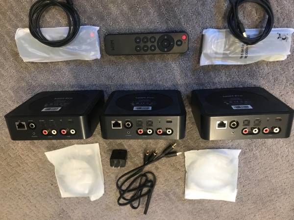 Each comes with a remote, and cables. Any 5v USB will power these. You Will need your own amp for each device. Or powered Monitors.