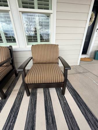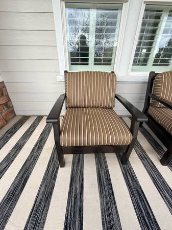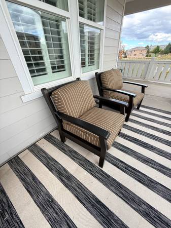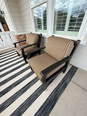 Heavy duty hard wood chairs were $800 each new. Lightly used on front porch. Weigh over 40 pounds each. Pair is available for $400. Similar to: Pottery Barn, Crate and Barrel, Restoration Hardware.