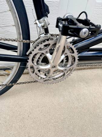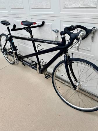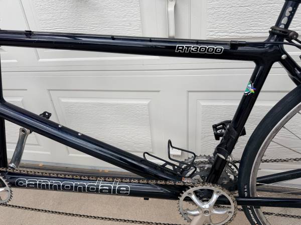 RT3000 1999 tandem/road bike with an aluminum T6 frame, with Shimano Ultegra Triple components, including Cane creek stem, a threadless Cane Creek C2 headset and dual-control Shimano Ultegra STI shifters. It has 9 speeds, a Shimano derailleur, weighs under 35 pounds and is fully rigid.