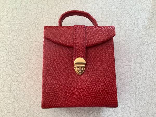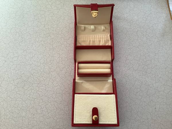 Travel Jewelry Box. #1859878. Push Button Snap Closure. Divided Areas. Holds 3- Rings, Earrings And Necklaces. 5" H x 3 1/2" W x 2" D. Has Original Box. $60.00