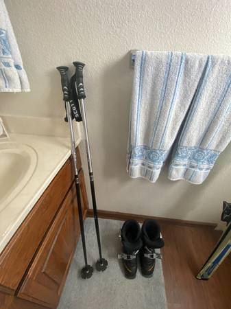 vintage ski's AND Cleaning out closets Frist person with $100 gets it all cash only Boots, polls, binding and Ski's Daughter had tiny feet so about size 5-6 ladies boots about 5feet - 2" tall near...