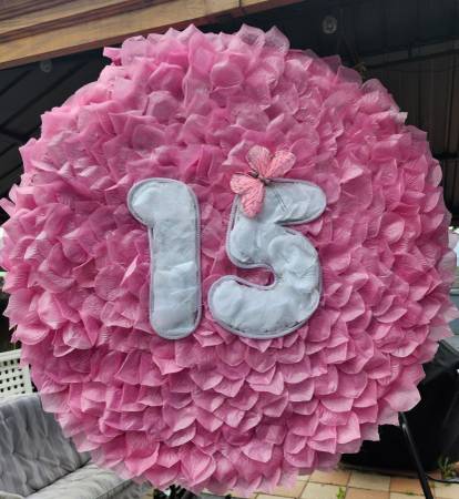 Hand made with fake rose petals. Each individually glued on. Also has sliver glitter on it. Text please quinceañera pinata, pinata