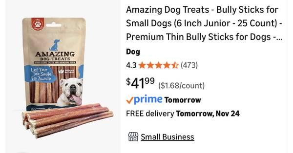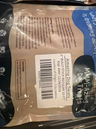 Amazing dog treats 100% all natural 25 count bully sticks. I’m selling them because my dog does not like them. One bag is brand new. The other bag has been opened but is still a full count of 25.