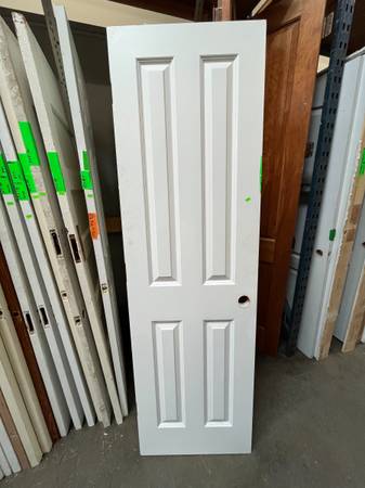 This 24-inch wide by 79-inch tall hollow core door features a classic 4-panel design. The door slab swings right hand and is sold as a slab only, without frame or hardware. It is ideal for interior use or as a replacement slab and shows normal wear consistent with prior use.