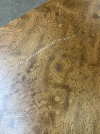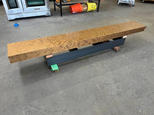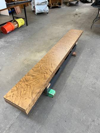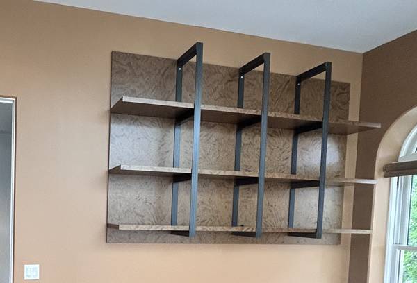 This large custom shelving unit features a striking wood veneer with a swirling burl-like grain pattern and a sturdy black steel frame. It consists of three tiers of long horizontal shelves supported by vertical steel dividers, offering both storage and display space. The veneer has some surface scratches and wear consistent with prior use (see close-up image), but overall, the unit is solid and structurally sound. Originally wall-mounted (see photo of in-use installation), but could be adapted for freestanding or reinstallation with proper supports.