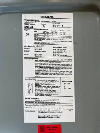 Siemens I-T-E heavy duty electrical enclosure box, rated for 100 amps, 240V AC / 250V DC. Includes Vacu-Break switch housing but components are non-functional. Ideal for parts, project use, or replacement housing.