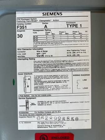 Siemens I-T-E heavy duty electrical enclosure box rated for 30 amps, 480V / 600V AC or 250V DC. Vacu-Break switch with Clampmatic action. Great for parts, testing setups, or repair applications.