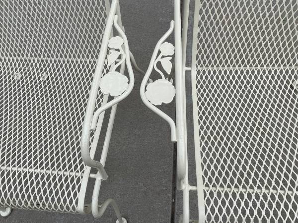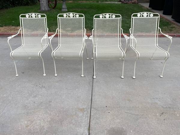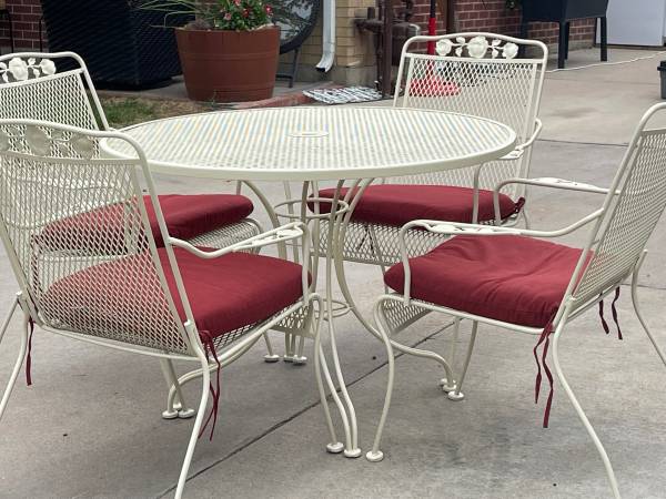 TABLE TOP W—42” H—29” 4 - WROUGHT IRON CHAIRS EXCELLENT CONDITION COLOR: GLOSS ALMOND BEAUTIFUL SET HEAVY WONT BLOW OVER IN WIND HOLE IN TABLE FOR A UMBRELLA NO RUST AT ALL ROSES PATTERN FIRM: $350...