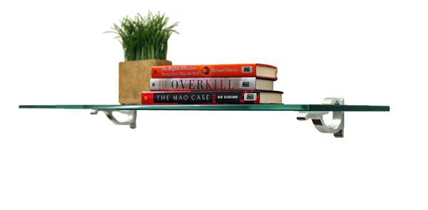#4 Floating Glass Shelves With Chrome Brackets Glass: 21" x 6" x 3/8", clean, no scratches, only had plastic supplement bottles on them Monarch Chrome Brackets: 3" H x 5" D x 3/4" W Thick Clear...