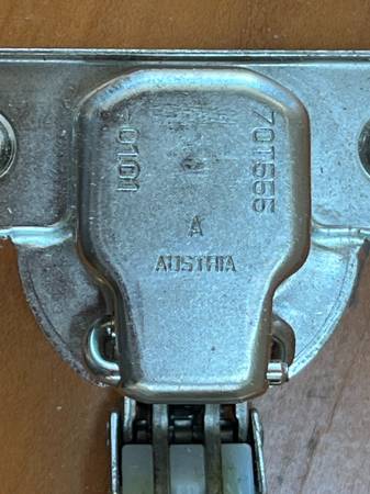 Pair of high-quality Blum European-style concealed hinges. These are Clip-Top models, made in Austria, designed for frameless or face-frame cabinets depending on mounting plate used. Smooth action, durable steel construction, and fully adjustable.