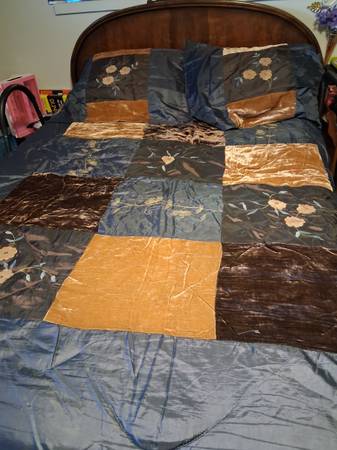 (2) patch work comforter set but gold tone, brown. Velvet, silk, accented with embroidered floral patterns. 2 pillows cases $20.