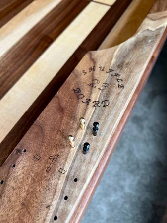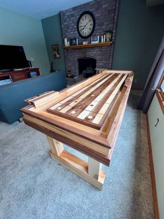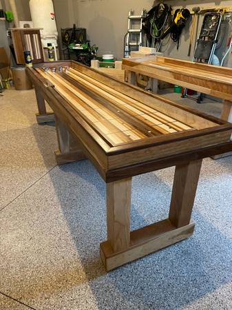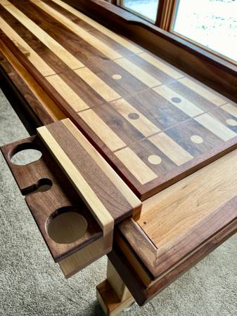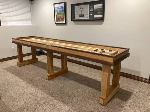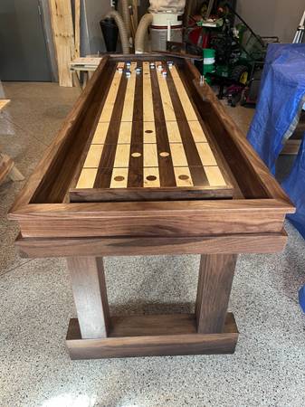 If you are looking for a statement piece for your home or game room, look no further! These custom shuffleboard tables are hand-crafted by a wood-working artisan in Wisconsin, using locally sourced black walnut and white maple hardwoods. Boards are built to order, and can be constructed anywhere between 7 feet to 15' (8' and 16' cages respectively).