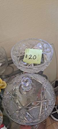 9)Beautiful pedestal crystal bowl with lid nicely cut very detailed 7"×8"×5" reflects the light beautiful. $20.