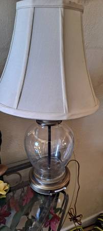 (12) Brown/silver lamp with cream color lamp shade. $20. 36"
