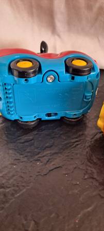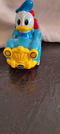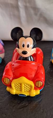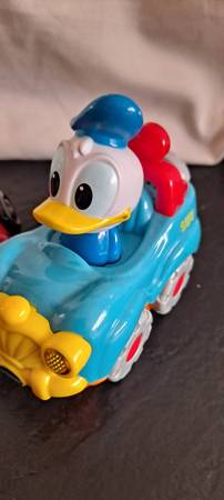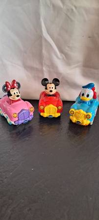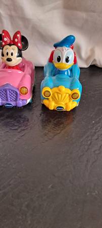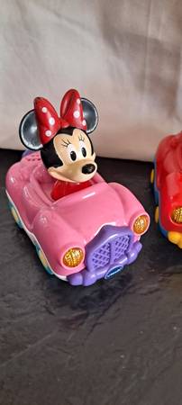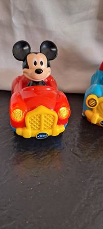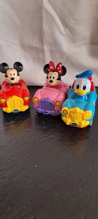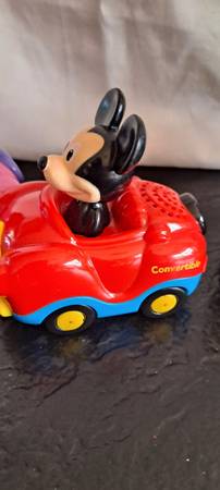 V tech Go!go! smart wheels, Disney ,Mickey Mouse in convertible, red and blue.Donald Duck in SUV mini mouse in convertible. 3 inches. all play music. Speak and head lights ,lite up. $29. In good used condition.