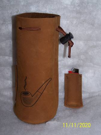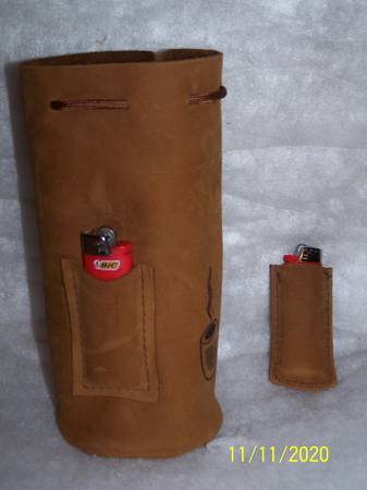 This bag has 2 smoking pipes stamped on it with a BIC lighter pocket sewn into the bag side.