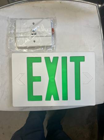 Commercial-grade LED exit sign with bright green lettering and white housing. Designed for dependable performance in offices, warehouses, retail stores, and other commercial or public spaces. Includes mounting hardware for ceiling, wall, or end installation.