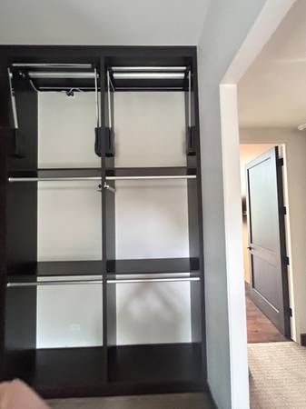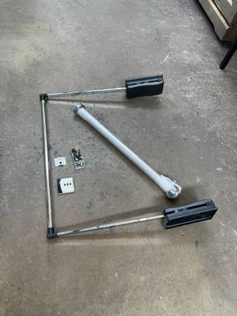 High-end Häfele motorized wardrobe lift designed for closets and cabinets, allowing effortless access to high-hanging garments. Features push-button remote operation that lowers the clothes rail up to 30 inches, then raises it back into place on its own. The system includes a 110 V plug and can be hard-wired for 220 V. Built with rugged steel arms, a chrome tube, and a black housing.