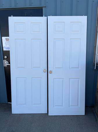 Clean, classic 6-panel interior bypass sliding doors — perfect for closets, pantries, or laundry areas. Includes metal roller hardware for smooth operation.