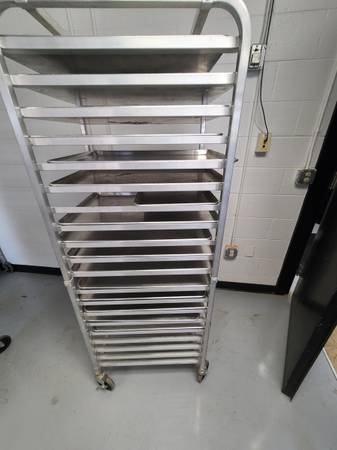 Aluminun sheet pan rack on casters with sheet pans $120 each Full sheet pans,bake, bakers.bakers rack ,cookies,dough. Cakes,cupcakes Bread racks. catering racks. Donut racks.pan racks
