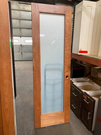 Unbranded modern solid cherry swing door with frosted glass