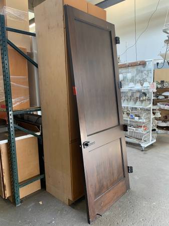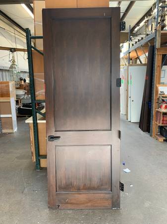 This is a solid core wood interior door, featuring a two-panel design with a modern dark espresso stain. It includes hinges and a lever handle. The door shows some cosmetic wear at the base and edges consistent with prior use, but remains structurally solid and in good working order. Its tall profile and solid construction make it suitable for upscale residential or office spaces.
