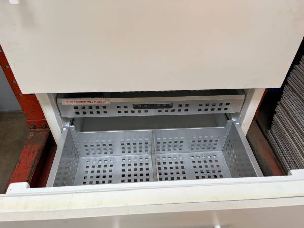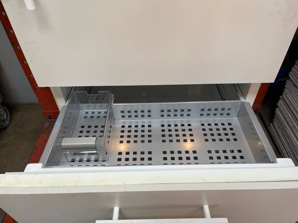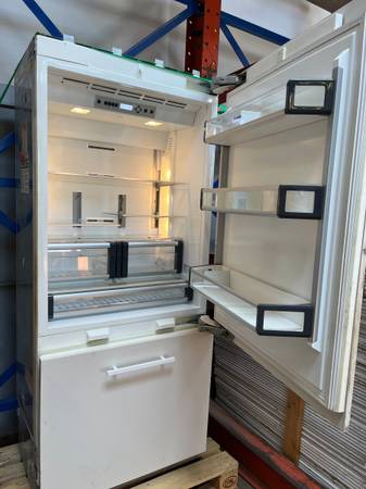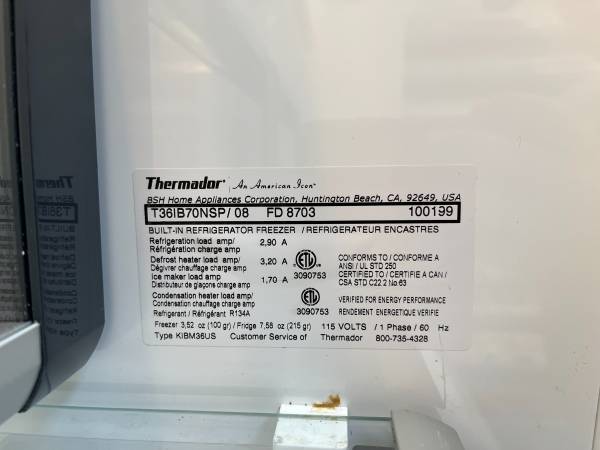 Thermador 36-inch built-in refrigerator with bottom freezer drawer. Model T36IB70NSP/08, panel-ready front with sleek modern handles. Upper refrigerator section features adjustable glass shelves, humidity-controlled produce drawers, and LED lighting. Lower freezer drawer includes two-tier storage baskets and dedicated ice bin. Energy-efficient design, 115V, R134A refrigerant. Light surface wear and minor scuffs from prior use; interior is clean and fully functional.