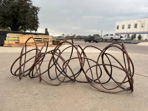 This one-of-a-kind metal fireplace sculpture features an abstract arrangement of looping and twisted 1/2 inch square wrought iron. Originally installed in a custom Denver home, it adds striking visual interest to any hearth, mantle, or display space.