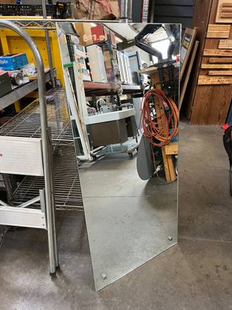 This is a rectangular wall mirror measuring 20 inches wide by 42 inches tall. It is frameless with polished edges and comes fitted with four chrome standoff mounting brackets for secure wall installation. The mirror is 1/4 inch thick, offering durability and clarity. Item is in good reclaimed condition with only light surface wear, suitable for use in bathrooms, bedrooms, entryways, or closets.