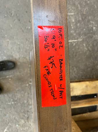 Nice interior railing section with solid wood rails, iron balusters and a square newel post. Fair condition with cosmetic wear but sturdy and ready for reuse.