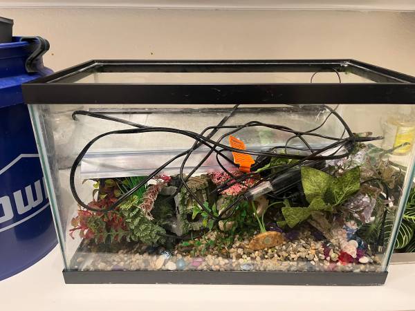 10 gallon aquarium. Is water tight and there are no cracks or broken pieces. Last used for fish so it comes with the following: