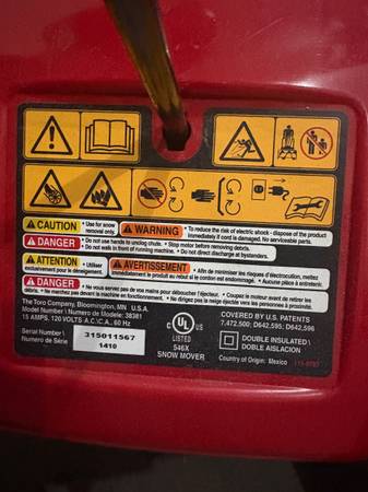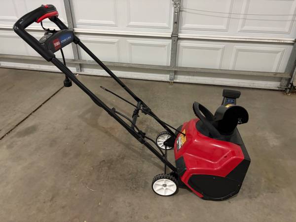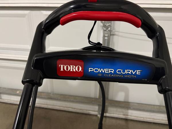 Toro Model #38381 electric “Power Curve” corded snow blower (18” width, 12” intake height, 15 amp, 120 volts, lightweight). Currently on Amazon for $289, Lowe’s $249 (check it out yourself). Used handful of times, works perfect. Will let it go for $200.