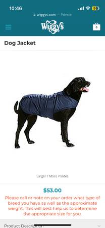 I have a black MADE IN COLORADO dog jacket. It is new as my old dog passed away before having a chance to use it. It is made by Wiggy's a company that makes top tier outdoor gear especially when it comes to winter gear. Side note I highly recommend their sleeping bags, I bought my first one 17 years ago and have only bought bags from them ever since. The size is large and I estimate it would fit well on most 60-80 pound dogs however the manufacturer suggests calling them to tell them your dogs weight and breed so that they can suggest what size you need. Their phone number is in one of the photos in this posting. Call or text Tyler 307-92zero-0741