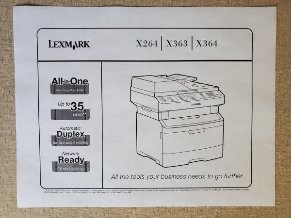 Laser Printer Lexmark X363DN Ethernet, USB Monochrome Scan, Copy, Fax, Print 35 ppm 2 Identical printers to choose from $150 each Full technical specs available on Xerox site. Installed and tested...