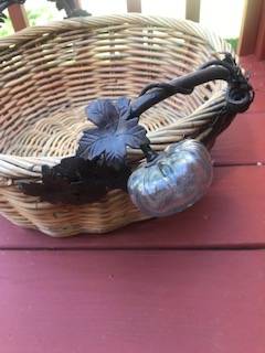 Wicker Basket with Metal/Glass Handles Only One Handle has the Glass Pumpkin Basket Height: 6 Inches Basket Diameter: 1 Foot, 5 Inches $15.00 CASH ONLY