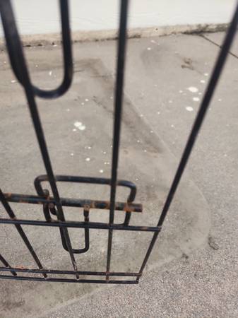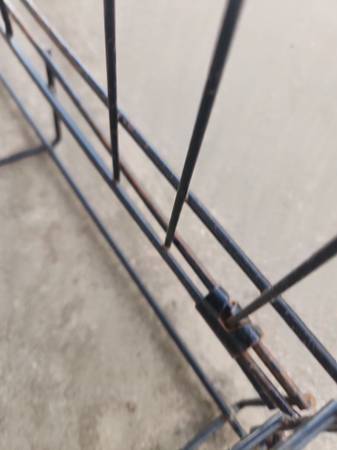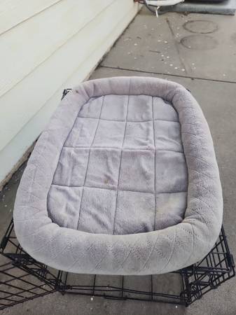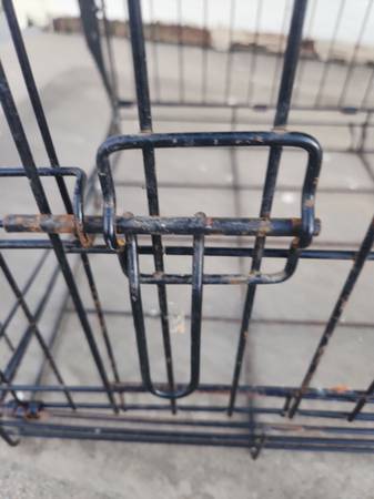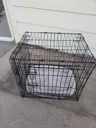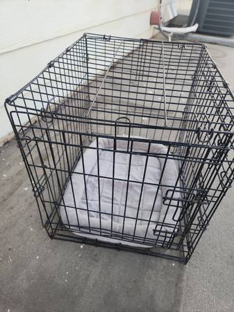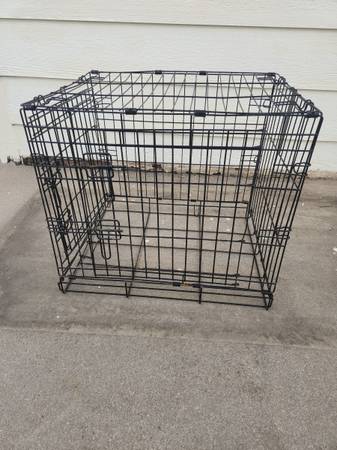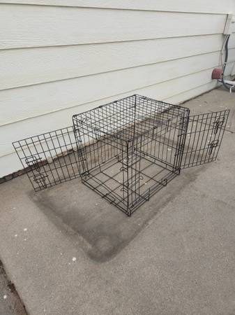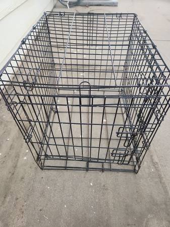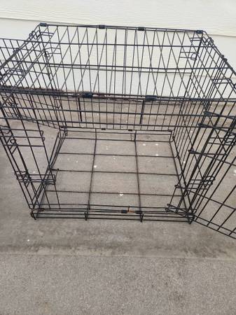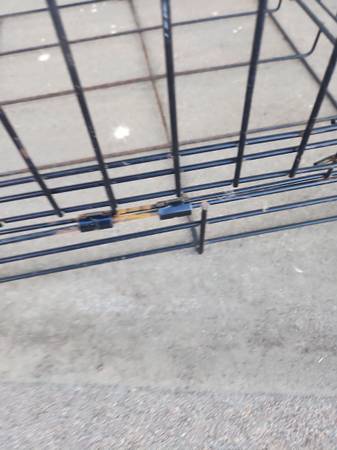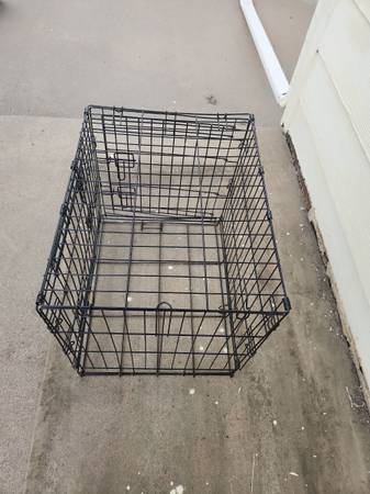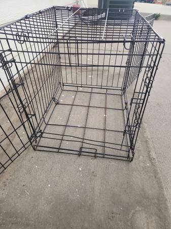 Used dog cage. Small size. Opens in front and on side. NO BOTTOM TRAY. Has rust from being outside. *see pics* Have bed you can use on the bottom if you want. Would also be good for livestock such as chickens. Measures roughly 24" long x 17" wide x 20" tall. Folds flat.