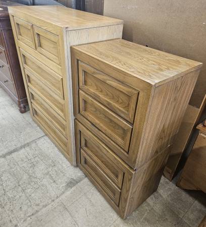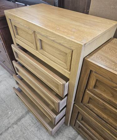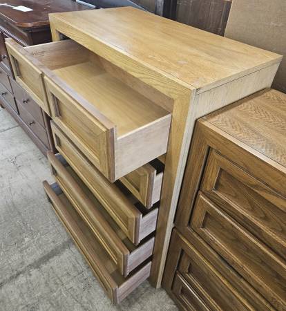 Beautifully crafted solid oak bedroom pieces by Huntley Furniture (a division of Thomasville), known for their exceptional craftsmanship and timeless appeal. This collection includes a 5-drawer highboy dresser and two matching nightstands, all featuring deep dovetailed drawers and a clean, paneled design. Perfect for those who appreciate durable, classic American-made furniture.