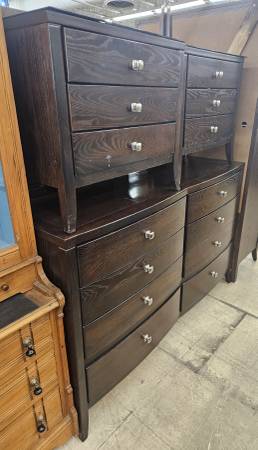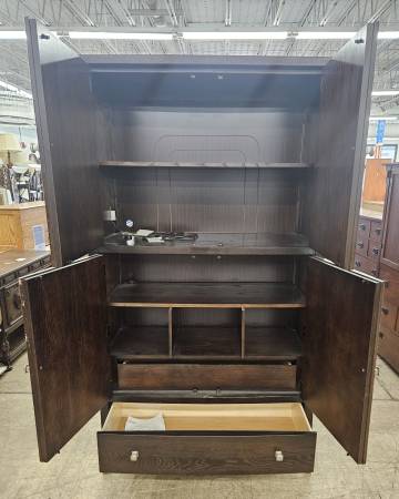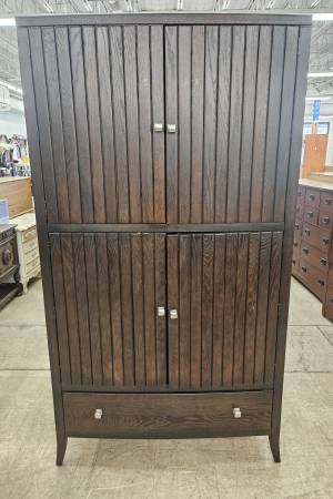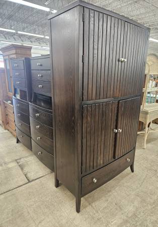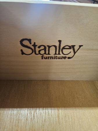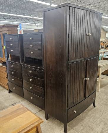 Transform your bedroom with this stunning Stanley Furniture bedroom collection! This high-end set features rich espresso wood grain, brushed metal hardware, and beautifully curved drawer fronts that add a modern touch of elegance. Includes a spacious dresser with matching armoire, two nightstands, and a queen bed frame — offering both style and substance. Built to last and designed to impress, this set brings luxury and functionality together in one timeless package.