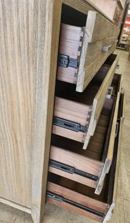 This is an 8-drawer dresser with a weathered wood finish and modern metal handles. The clean lines, full-extension drawer glides, and sturdy frame make it practical for bedroom or storage use.