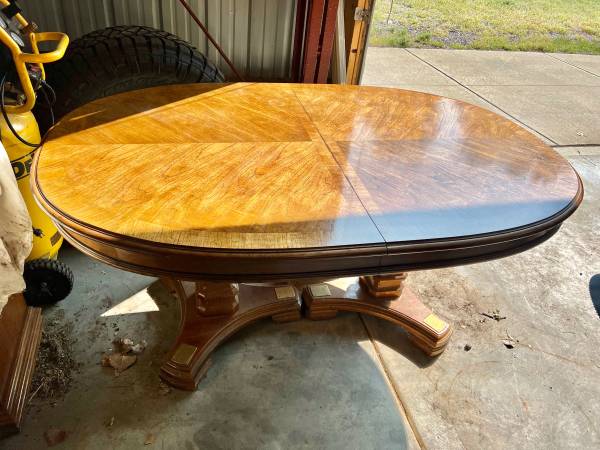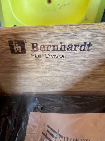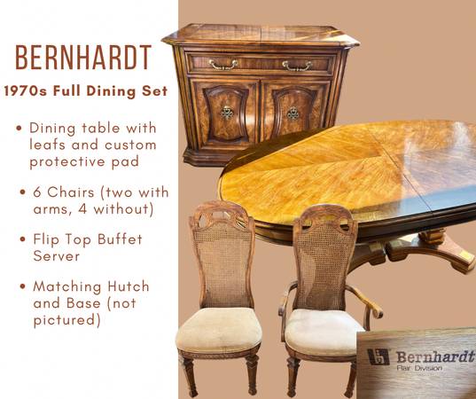 Beautiful 1970s Bernhardt dining set: table with leafs and protective cover, chairs with minimal signs of wear, lift top server, and hutch. The wood grain in this set is gorgeous. Rare find for...