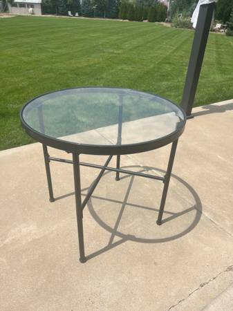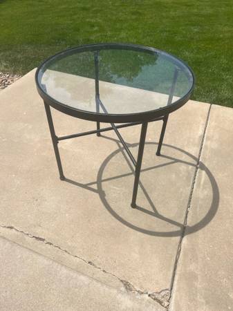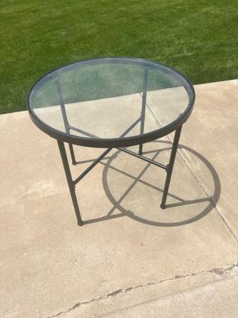 Crate and Barrel Round Modern Black Metal Base with Thick Glass Top Great quality. Heavy, Stable & Sturdy. Can be used as a Small Dining Table or Outdoor Patio Table measures: 32” diameter x 28...