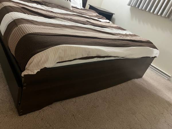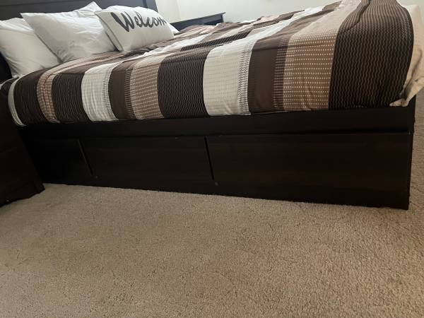 With dresser and two side tables. It’s a platform bed, so no box springs needed unless you want them. We never used one. The bed comes with 6 drawers, lots of storage. The color is espresso. The bed frame itself is about 80 inches wide. Bought two years ago. Comes with Casper mattress for an extra $100. The mattress is older than the bed set. $400 without mattress or $500 for everything. Really comfortable bed, we just upgraded to a