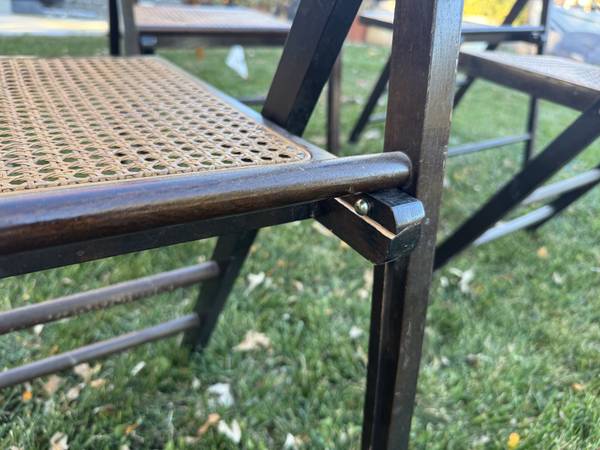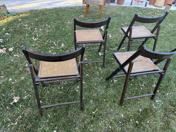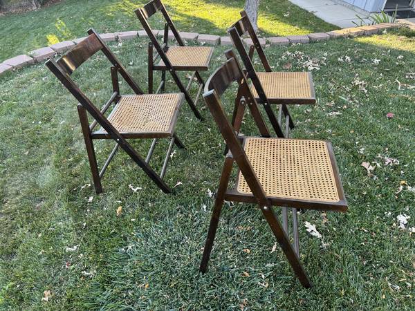 Beautiful set of FOUR (4) wooden folding chairs with stunning whicker seats. Can be used indoor or outdoors.