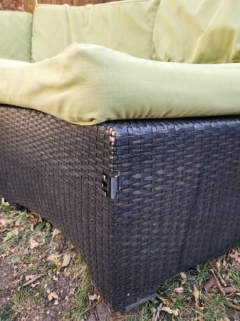 Half moon sectional wicker couch. Perfect as outdoor patio furniture with seating for 2-3 people.