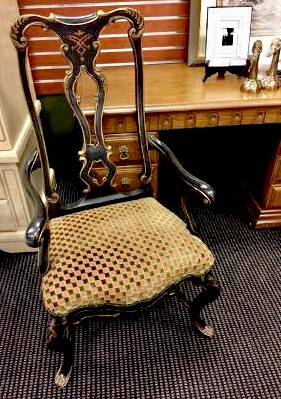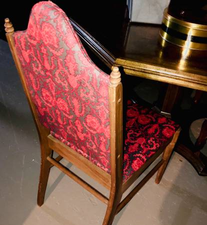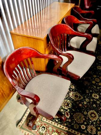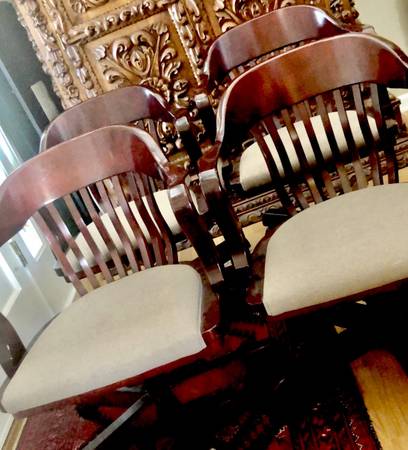 FIRST PICTURE a set of 4 bankers chairs. Very well made, these chair are rare and antique, with new upholstery. Very sturdy and heavy, these are the perfect chairs for a cool game table or small dining. Similar chairs from same maker sell for $750 each online.