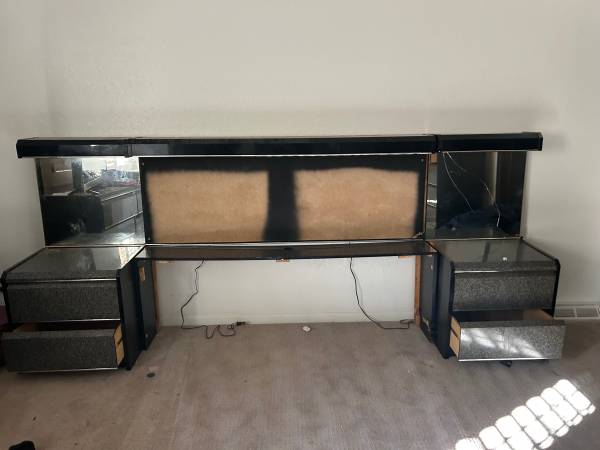 Bedset: headboard, two drawers on each side at top and mirrors (one has small crack) above drawers. Complete headboard has lights across top, drawers (2x3),drawers (1x5). COMPLETE SET $100