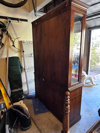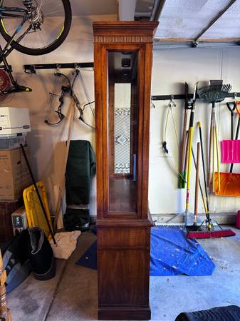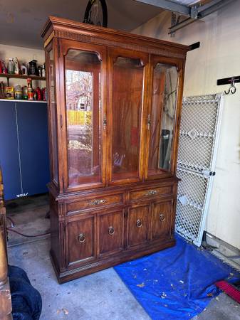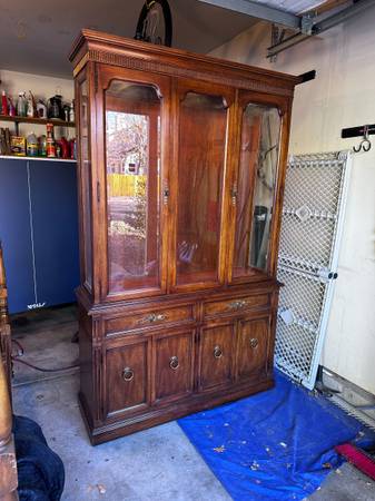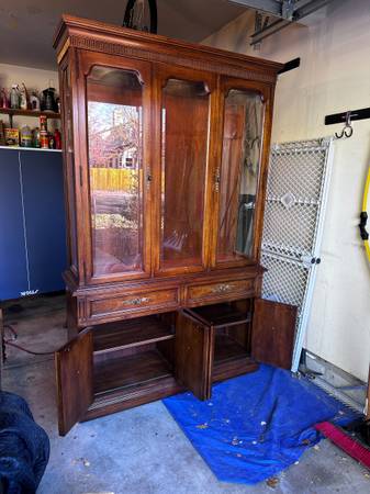 China Cabinet with 4 glass shelves. Glass doors. Glass Side Panels. We will not assist with moving or loading this piece so plan accordingly. Internal depth 12" Internal Lighting
